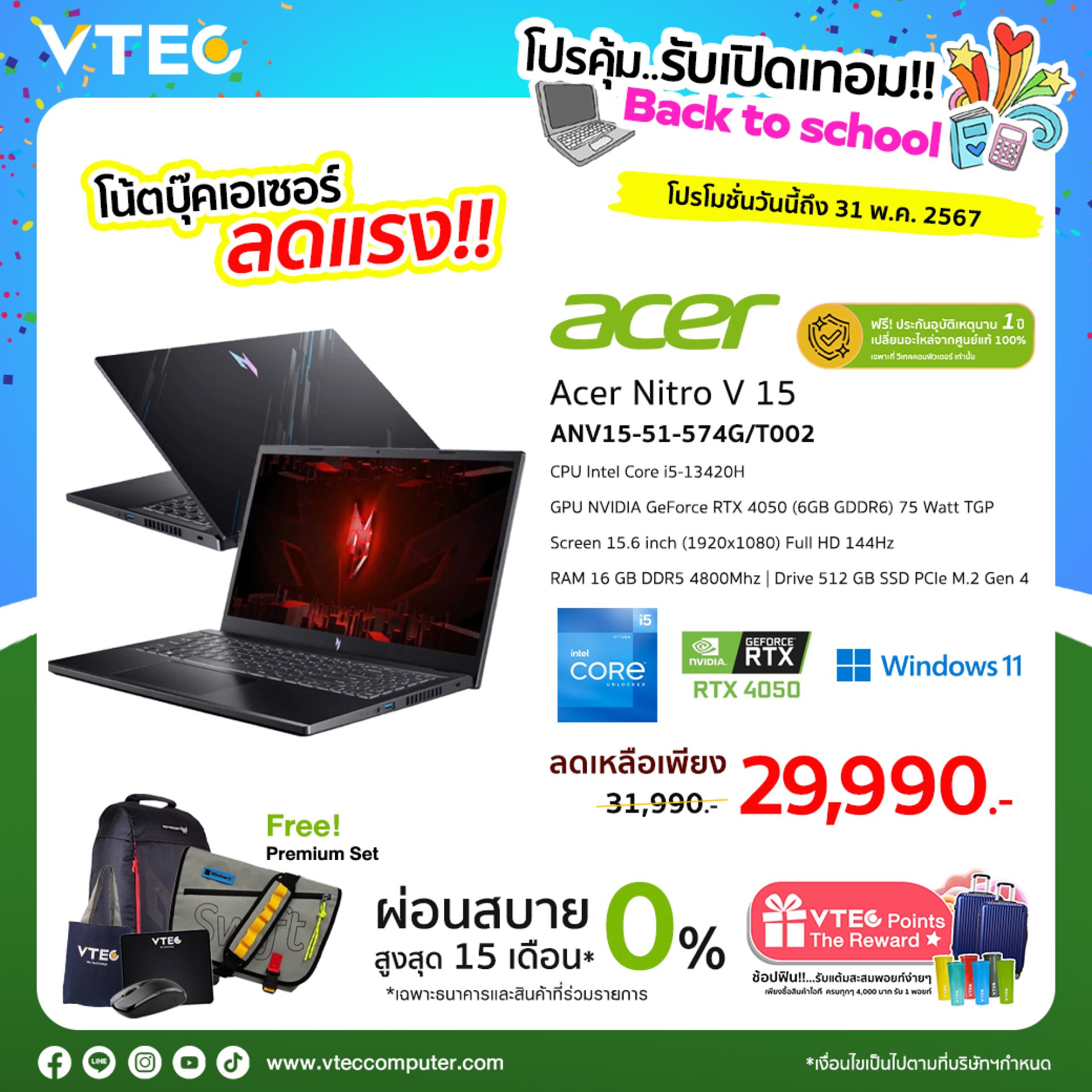 โน้ตบุ๊คเกมมิ่ง #Acer ลดแรง รับเปิดเทอม Acer Nitro V 15 รุ่น ANV15-51-574G/T002 ( ปกติ 31,990.- ) ลดเหลือเพียง 29,990.-