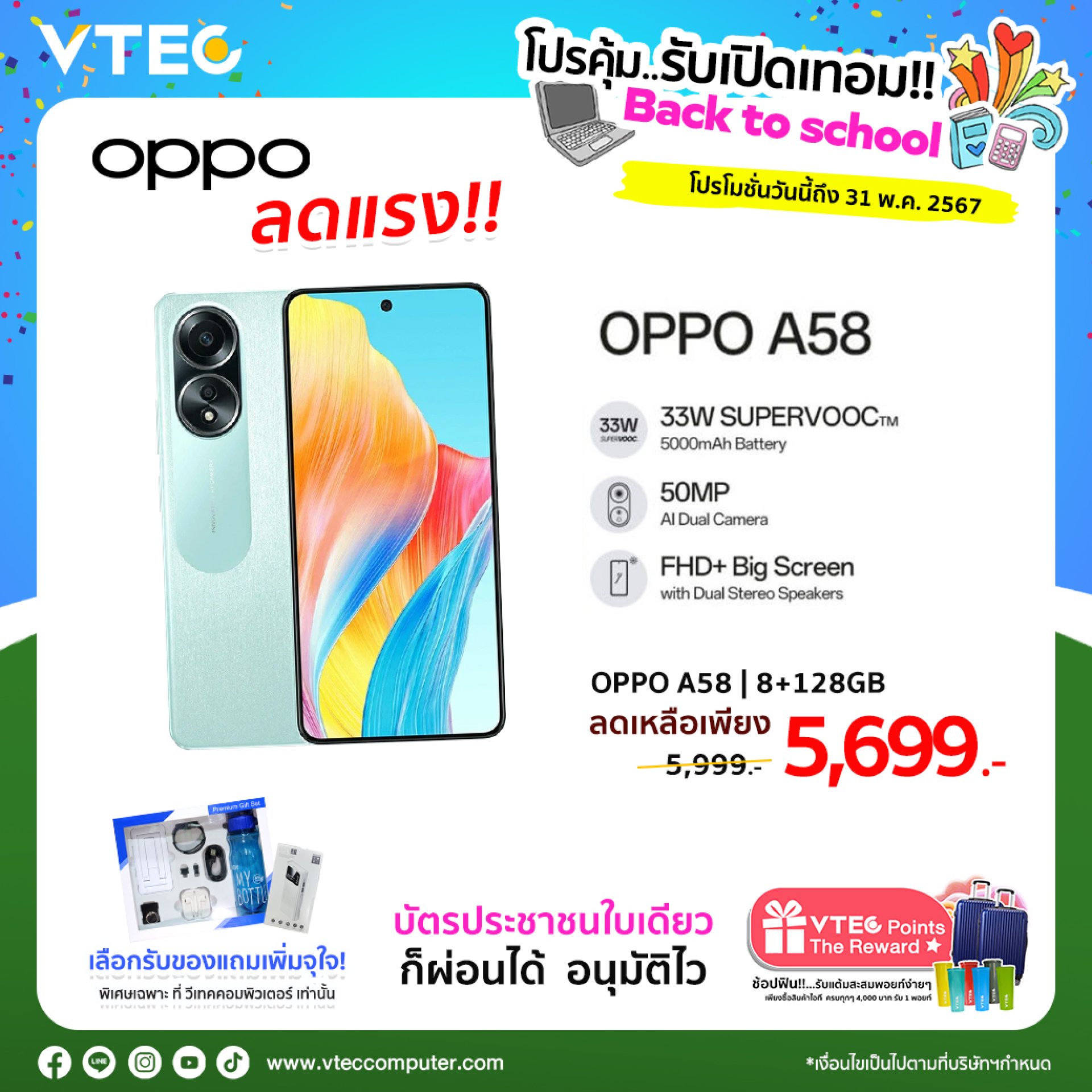 มือถือ OPPO ลดแรงรับเปิดเทอม ที่ วีเทคคอมพิวเตอร์ OPPO A58 | 8+128GB ( ปกติราคา 5,999.- ) ลดเหลือเพียง 5,699.-