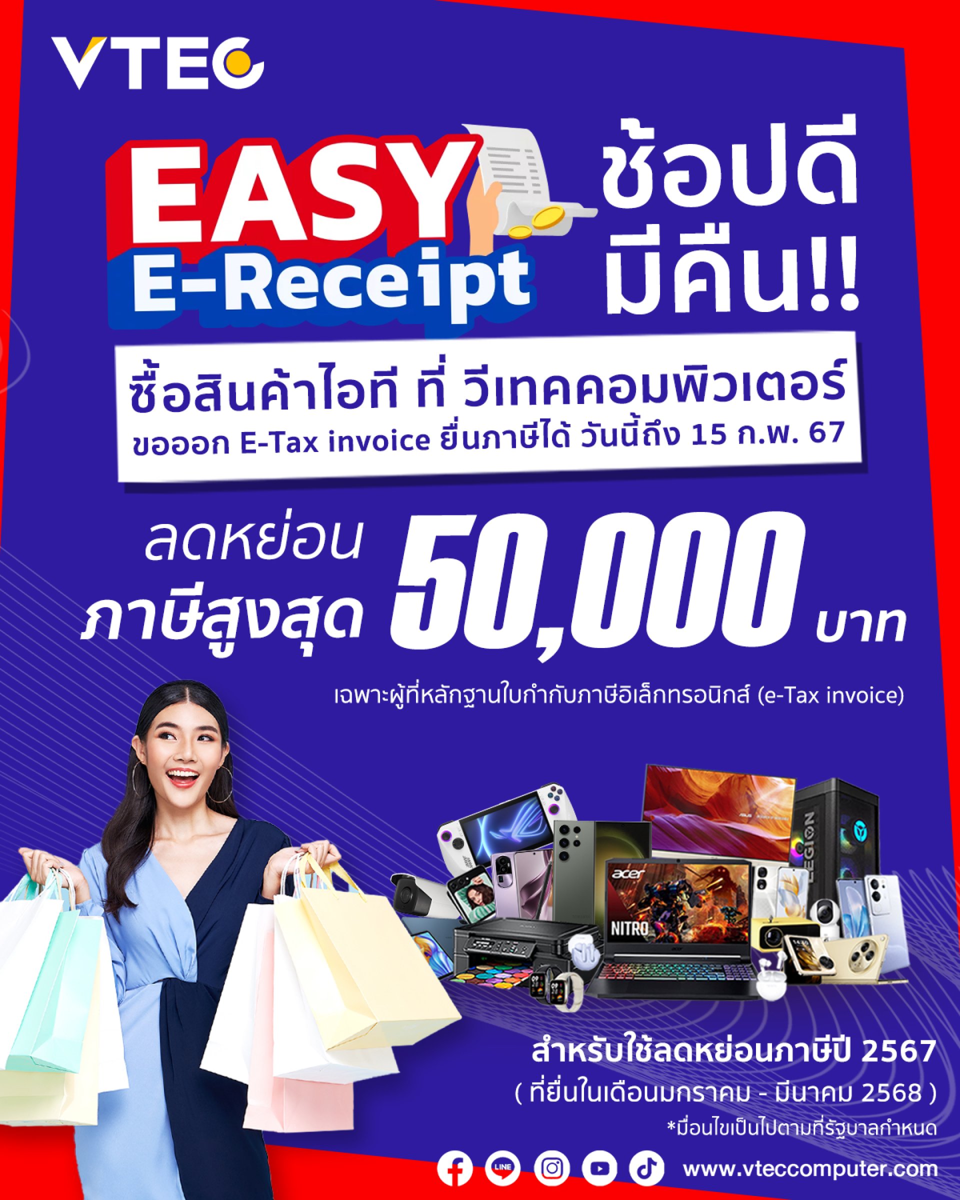 วีเทคคอมพิวเตอร์ ขานรับนโยบายรัฐบาล Easy E-Receipt 2567 ช้อปสูงสุด 50,000 บาท รับสิทธิ์ลดหย่อนภาษีได้ตามจริง*